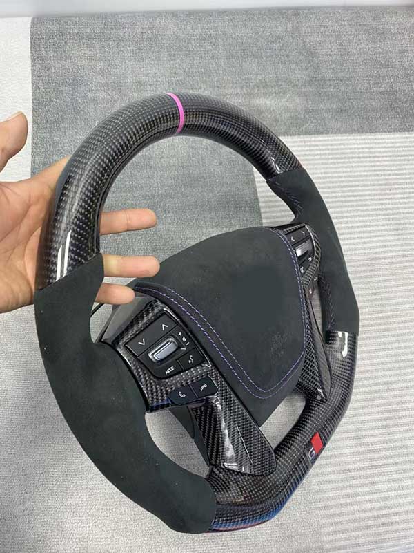 Manufactured from high-grade carbon fiber and premium leather, this steering wheel provides a lightweight structure, enhanced grip, and a sporty, modern appearance.